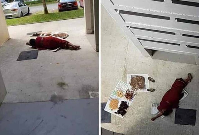 அந்தம்மா மிளகாய், மல்லி, மஞ்சள் என மசாலா பொருள்களை நடைபாதையில் காயவைத்து அதற்கு பாதுகாவலராக பக்கத்திலேயே படுத்து உறங்கியும் உள்ளார். உள்ளூர்வாசிகள் பேஸ்புக்கில் அதை பதிவிட்டுள்ளனர்.