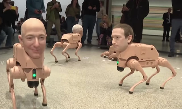 ஜெர்மனியின் பெர்லின் நகரில் நடைபெற்ற கண்காட்சியில், உலகத்தின் மிகப்பெரும் பணக்காரர்களான எலான் மஸ்க், மார்க் ஜுகர்பர்க், ஜெப் பெசோஸ் உள்ளிட்ட பல்வேறு கோடீஸ்வரர்களின் முகமூடிகள் பொருத்தப்பட்ட நாய் வடிவ ரோபோக்கள் பார்வையாளர்களின் கவனத்தை ஈர்த்தன.
