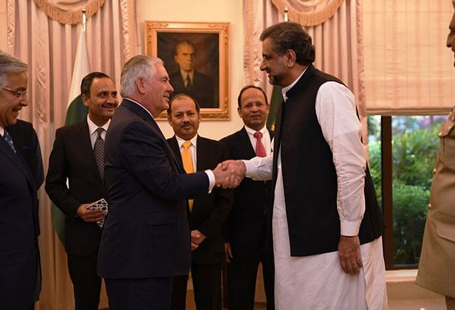அமெரிக்க வெளியுறவு மந்திரி ரெக்ஸ் டில்லர்சன் இந்தியா, பாகிஸ்தான், சவுதி அரேபியா, கத்தார், சுவிட்சர்லாந்து என 5 நாடுகளில் ஒரு வார கால சுற்றுப்பயணம் மேற்கொண்டு வருகிறார். சவுதி அரேபியா, கத்தார் நாட்டு சுற்றுப்பயணத்தை முடித்து கொண்டு அவர் நேற்று பாகிஸ்தான் சென்றார். இன்று பாகிஸ்தான் பிரதமர் ஷாகித் கான் அப்பாஸியை சந்தித்து பேசிய டில்லர்சன், இரு தரப்பு ஒத்துழைப்பு, பங்களிப்பு மற்றும் பொருளாதார உறவுகளை விரிவுபடுத்துவது ஆகியவை குறித்து ஆலோசனை நடத்தினார்.