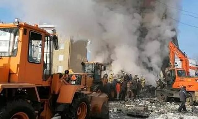 ரஷியாவின் தென்கிழக்கு பகுதியில் சகலின் தீவில் உள்ள திமோவ்ஸ்கோய் நகரில் 5 மாடிகளை கொண்ட குடியிருப்பு கட்டிடம் ஒன்று உள்ளது. 1980-ல் கட்டப்பட்ட இந்த கட்டிடத்தில் பல குடும்பங்கள் வசித்து வந்தன. இந்த நிலையில் நேற்று அதிகாலை இந்த அடுக்குமாடி குடியிருப்பில் உள்ள ஒரு வீட்டில் கியாஸ் சிலிண்டர் வெடித்து சிதறியது. இதில் குடியிருப்பு கட்டிடத்தின் ஒரு பகுதி இடிந்து விழுந்தது.