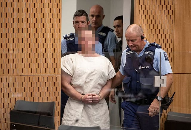 நியூசிலாந்தின் கிழக்கு கடலோர நகரமான கிரைஸ்ட்சர்ச்சிலுள்ள இருவேறு மசூதிகளில் நேற்று (வெள்ளிக்கிழமை) துப்பாக்கி ஏந்திய நபர் நடத்திய தாக்குதலில் 49 பேர் உயிரிழந்தனர். இந்த சம்பவம் தொடர்பாக கொலை குற்றம் சாட்டப்பட்டுள்ள பிரென்டன் டர்ரன்ட் என்னும் 28 வயதான ஆஸ்திரேலியர் ஒருவர் இன்று (சனிக்கிழமை) நீதிமன்றத்தில் ஆஜர்படுத்தப்பட்டார். வெள்ளை நிற சட்டை அணிந்து இருந்த அவர், கைவிலங்கு அணிவித்தபடி ஆஜர்படுத்தப்பட்டார்.