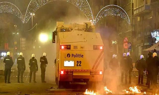 பெல்ஜியத்தில் போலீசார் மீது மொராக்கோ ரசிகர்கள் பட்டாசுகளை கொளுத்தி போட்டும் வாகனங்களுக்கு தீ வைத்தும் ரகளையில் ஈடுபட்டனர். இதனால் அங்கு பதட்டமான சூழ்நிலை நிலவியது. அந்த பகுதி முழுவதும் தீ பிழம்பாக காட்சி அளித்தது.