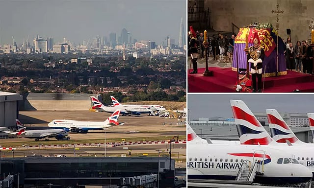 மகாராணியின் இறுதிச் சடங்கு நடைபெறும் நாளில், லண்டனின் ஹீத்ரோ விமான நிலையத்திற்குச் செல்லும் மற்றும் அங்கிருந்து புறப்படும் விமானங்கள் அனைத்தும் ரத்து செய்யப்படுகின்றன.
