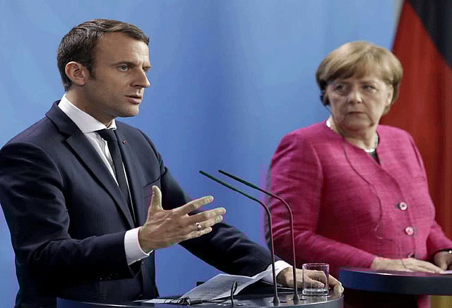 பதவியேற்ற பிறகு ஜெர்மனிக்கு சென்றுள்ள பிரஞ்சு அதிபர் அங்கு ஜெர்மன் அதிபர் மெர்கலுடன் பேச்சு வார்த்தை நடத்தவுள்ளார். பிரஞ்சு அதிபரின் ஐரோப்பிய பொருளாதாரத்திற்கு முன்னுரிமை கொடுக்கும் திட்டத்திற்கு ஆதரவளித்தாலும் இது சுதந்திர வர்த்தக கோட்பாடுகளுக்கு எதிராக அமையும் என்கிறார். பிரஞ்சு அதிபர் இனிமேல் தனது நாடு தேவைக்கேற்ப புதிய ஒப்பந்தங்களை ஐரோப்பிய ஒன்றியத்தில் கொண்டு வர தடையில்லை என்கிறார். முக்கிய துறைகளில் ஐரோப்பிய நிறுவனங்கள் வேறு கண்டத்து நாடுகளின் வசம் போகக்கூடாது என்பதில் இரு நாட்டுத்தலைவர்களும் ஒரே கருத்துடன் உள்ளனர்.