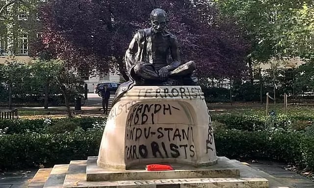 இங்கிலாந்து நாட்டின் லண்டன் டவிஸ்டோக் சதுர்க்கத்தில் மகாத்மா காந்தி சிலை உள்ளது. இந்த காந்தி சிலை நேற்று மர்ம நபர்களால் உடைத்து சேதப்படுத்தப்பட்டுள்ளது. மேலும், சிலை அமைந்துள்ள பகுதியில் காந்தி, மோடி இந்திய பயங்கரவாதிகள் என எழுதப்பட்டிருந்தன.