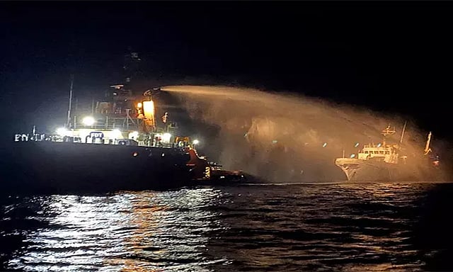 இந்நிலையில், மால்டா கடற்கரை பகுதியில் நேற்று அந்த கப்பல் மீது வெடிகுண்டு தாக்குதல்கள் நடத்தப்பட்டன. இதனால் கப்பலில் தீ பிடித்து கொண்டது. தீ மளமளவென மற்ற பகுதிகளுக்கும் பரவியது. கப்பல் நீரில் மூழ்கும் நிலைக்கு தள்ளப்பட்டது.