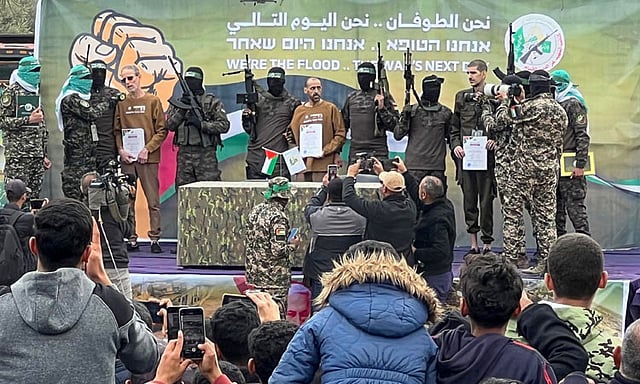 அதே சமயம், முகமூடி அணிந்த ஹமாஸ் ஆயுதக்குழுவினர் பலர், துப்பாக்கிகளுடன் அதே இடத்தில் கூடினர். பின்னர் ஒரு வெள்ளை நிற வாகனத்தில் இருந்து ஹமாஸ் அமைப்பினர் 3 இஸ்ரேலிய பணய கைதிகளையும் அழைத்து வந்து, அங்கு அமைக்கப்பட்டிருந்த ஒரு தற்காலிக மேடையில் நிற்க வைத்தனர். தொடர்ந்து பணய கைதிகளிடம் மைக்கை கொடுத்து பேசுமாறு கூறினர். இவ்வாறு பணய கைதிகளை ஹமாஸ் அமைப்பினர் பொதுவெளியில் பேச வைத்தது இதுவே முதல் முறையாகும்.