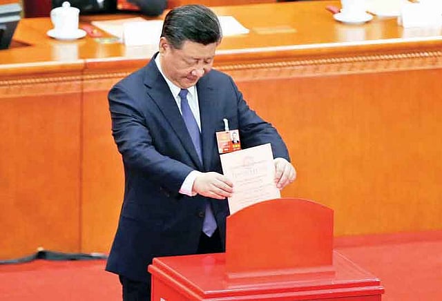 அதில் அரசியல் சாசன திருத்தத்துக்கு சம்மதம், சம்மதம் இல்லை, ஓட்டெடுப்பை புறக்கணிக்கிறேன் என்று 3 தெரிவுகள் இருந்தன. அதிபர் ஜின்பிங், முதலில் தனது ஓட்டை சிவப்பு நிற ஓட்டுப்பெட்டியில் செலுத்தினார்.
