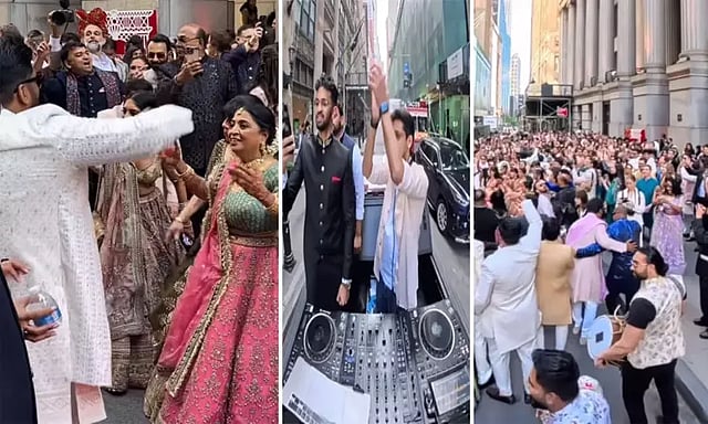 இந்நிலையில் அமெரிக்காவின் நியூயார்க்கில் நடைபெற்ற இந்திய திருமண ஊர்வலம் குறித்த வீடியோ வைரலாகி வருகிறது. அங்குள்ள வால் ஸ்டிரீட் பகுதியில் லோயர் மன்ஹாட்டன் தெருக்களில் சுமார் 400 பேர் அடங்கிய திருமண ஊர்வலம் நடைபெற்றது. மணமகனின் ஊர்வலம், பாரம்பரிய இந்திய உடையில் விருந்தினர்கள், அசத்தலான நடனம் மற்றும் பாலிவுட், பாப் இசையின் கலவையுடன் டி.ஜே. இசை என திருமண கொண்டாட்டம் களைகட்டி காணப்பட்டது.
