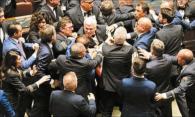 இதற்கிடையே நாடாளுமன்றத்தில் தாக்குதல் நடைபெற்ற சம்பவம் அங்குள்ள சமூகவலைதளங்களில் வைரலாக பரவியது. இத்தாலியில் உலக நாடுகள் பங்கேற்கும் ஜி-7 மாநாடு நடைபெற்று வருகிறது. இந்த சூழ்நிலையில் நாடாளுமன்றத்தில் எம்.பி.க்கள் இடையே ஏற்பட்ட மோதல் அங்கு பெரும் பரபரப்பை ஏற்படுத்தி உள்ளது.