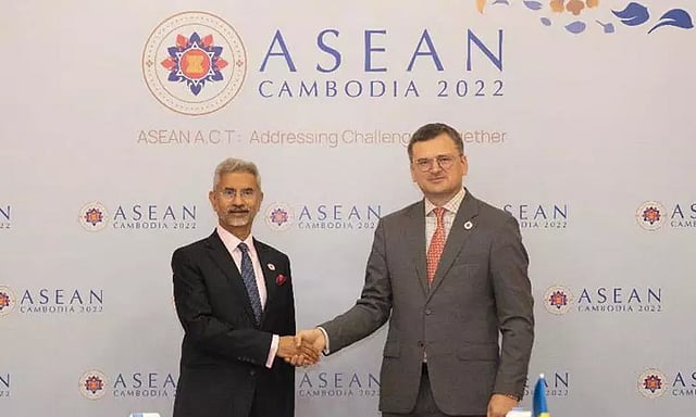 கம்போடியா தலைநகர் புனோம் பென்னில் இன்று நடைபெற்ற ஆசியான்-இந்தியா உச்சி மாநாட்டில் வெளியுறவுத்துறை மந்திரி எஸ் ஜெய்சங்கர் உக்ரைன் வெளியுறவு மந்திரி டிமிட்ரோ குலேபாவை சந்தித்தார். இந்த சந்திப்பில், உக்ரைன் போர், அணு ஆயுத அச்சுறுத்தல் உள்ளிட்ட பலதரப்பு விவகாரங்கள் குறித்தும் இரு தலைவர்களும் பேசினர்.