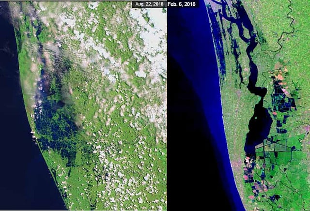 இந்த் நிலையில் அமெரிக்காவின் விண்வெளி ஆய்வகம் கேரளாவின் பகுதிகளில் வெள்ளம் பெருக்கெடுத்து ஓடும் பகுதிகளையும் அதற்கு முன் அங்கு எடுக்கபட்ட சேட்டிலைட் படங்களையும் வெளியிட்டு உள்ளது. வேப்பநாட் ஏரியைச் சுற்றியுள்ள பகுதியின் இரு செயற்கைக்கோள் படங்களும், ஆலப்புழா, கோட்டயம், சாங்கநேசரி மற்றும் திருவல்லா ஆகிய இடங்களும் அடங்கும்.