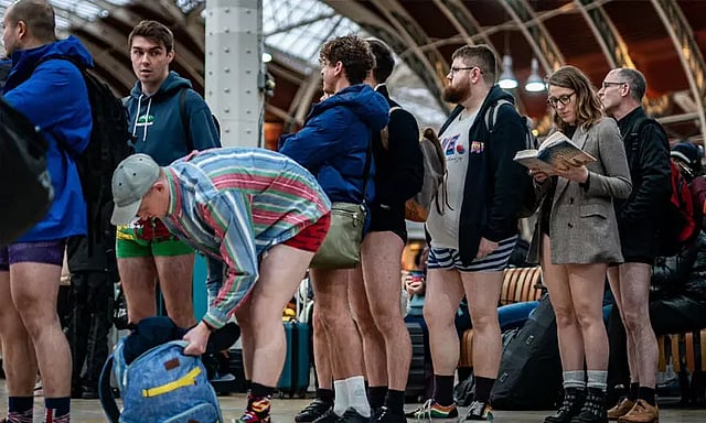 அவர்கள், ரெயில் நிலையத்திற்கு வந்தடைந்ததும் தங்களது பேண்ட்டை கழற்றி விட்டு, ரெயிலில் ஏறுகின்றனர். எனினும், மேல்பகுதியில் குளிர்கால ஆடைகளுடன் காணப்படுகின்றனர். தொப்பி, கையுறை, குல்லா போன்றவற்றை வழக்கம்போல் அணிந்து கொள்கின்றனர். காலணி போன்றவற்றையும் கூட அணிந்து உள்ளனர்.