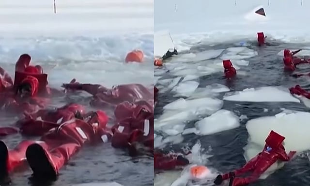 சிவப்பு நிறத்தில் விண்வெளி உடை போல் தோற்றமளிக்கும் வெப்பத்தை தக்கவைக்கும் சிறப்பு உடைகள் அணிந்து, உறைபனிக்கு நடுவே நீர்நிலையில் மிதந்தனர்.