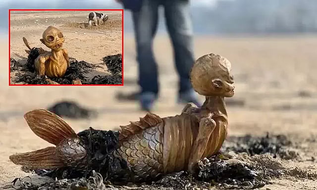 இங்கிலாந்தில் உள்ள பீச் ஒன்றில் பவுலா மற்றும் தவே ரீகன் தம்பதி பொழுது போக்கி கொண்டிருந்தது. அப்போது, அவர்கள் கண்ட காட்சி அவர்களுக்கு அதிர்ச்சியை ஏற்படுத்தியது. கென்ட் பகுதியில் மார்கேட் என்ற இடத்தில் ஒன்றாக பீச்சில் அவர்கள் சுற்றி திரிந்தபோது, கடல் கன்னி போன்ற உருவம் கொண்ட அந்த மர்ம உயிரினம், பாதி மணலில் புதைந்த நிலையில் இருந்தது.