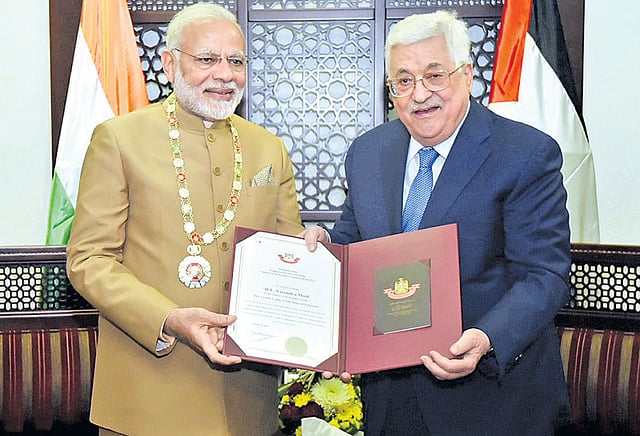 அதைத்தொடர்ந்து அதிபர் மெகமூத் அப்பாஸ் சார்பில் மோடிக்கு அரசு மரியாதையுடன் உற்சாக வரவேற்பு அளிக்கப்பட்டது. அப்போது, பாலஸ்தீனம் சார்பில் இருநாடுகளின் உறவுக்கு பாடுபட்டமைக்காக கிராண்ட் காலர் என்னும் மிக உயரிய விருதை மோடிக்கு, அப்பாஸ் வழங்கினார்.