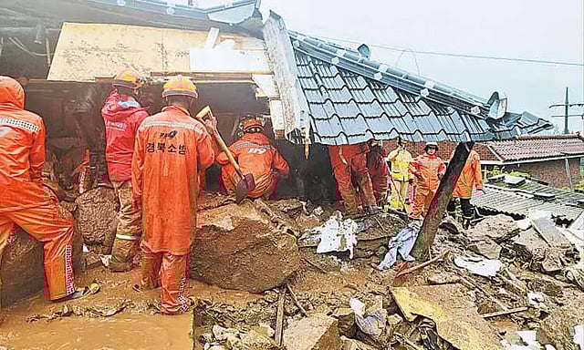 தென்கொரியாவில் கடந்த சில நாட்களாக கனமழை பெய்து வருகிறது. இதனால் ஏற்பட்ட வெள்ளப்பெருக்கில் அங்கு பல வீடுகள் இடிந்து தரைமட்டமாகின. அங்குள்ள நோன்சான், யோங்ஜூ ஆகிய பகுதிகளில் வீடுகள் இடிந்து விழுந்தது.