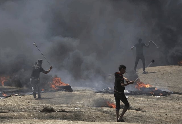 அந்த வகையில், பாலஸ்தீனத்தில் இஸ்ரேல், காசா எல்லையில் நேற்று முன்தினம் பெரிய அளவில் ஒரு போராட்டம் நடந்தது. இஸ்ரேலுக்கு எதிரான இந்த போராட்டத்தில் பல்லாயிரக்கணக்கானோர் கலந்து கொண்டனர். அப்போது வன்முறை மூண்டது. டயர்கள் தீயிட்டு கொளுத்தப்பட்டன. கற்களும், வெடிப்பொருட்களும் வீசப்பட்டன.