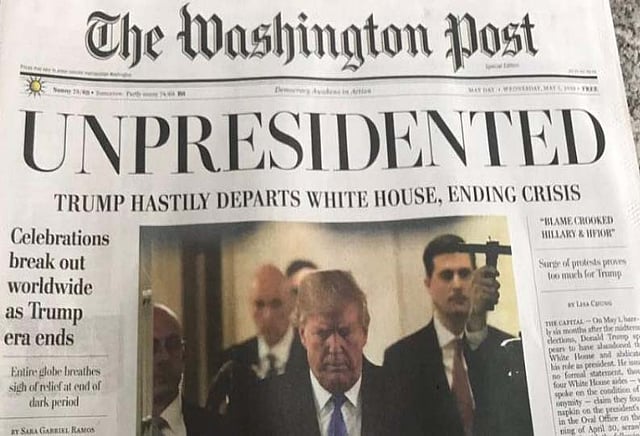பத்திரிகையின் இடது பக்கத்தில், நீண்ட ஒற்றை காலத்தில் அறிக்கை இருந்தது. அதன் தலைப்பில் டிரம்ப் சகாப்தம் முடிவடைகிறது என உலகெங்கிலும் கொண்டாடப்படுகின்றது. செய்தித்தாள் மே 1, 2019 என தேதியிடப்பட்டு இருந்தது.