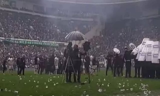 தொடர்ந்து ரசிகர்களிடையே மோதல் வெடித்த நிலையில், மைதானத்திற்குள் சிலர் பட்டாசுகளை கொளுத்தி தூக்கிப் போட்டதால் அங்கு பெரும் பரபரப்பு ஏற்பட்டது. மேலும் தண்ணீர் பாட்டில்கள் உள்ளிட்ட பொருட்களையும் மைதானத்திற்குள் வீசி எறிந்தனர். இதனால் அங்கு ரசிகர்களிடையே வன்முறை உருவானது.