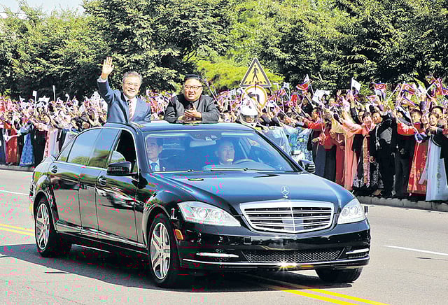 அதன்பின்னர் இரு தலைவர்களும் திறந்த காரில் பியாங்யாங் அரசு விருந்தினர் மாளிகைக்கு சென்றனர். வழி நெடுக அவர்களை வடகொரிய மக்கள் மலர்களைத் தூவி வரவேற்று தங்கள் மகிழ்ச்சியைத் தெரிவித்தனர்.