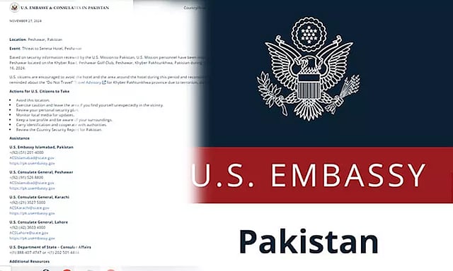 பாகிஸ்தானின் செயல்பட்டு வரும் அமெரிக்க தூதரகத்தால் பெறப்பட்ட பாதுகாப்புத் தகவலின் அடிப்படையில், நேற்று(27.11.2024) முதல் டிசம்பர் 16 வரை பாகிஸ்தானின் பெஷாவர் கோல்ப் கிளப், பெஷாவர், பெஷாவர் கோல்ப் கிளப், கைபர் சாலையில் அமைந்துள்ள செரீனா ஹோட்டல் பெஷாவர் ஆகியவற்றில் பயன்படுத்துவதை தவிர்க்குமாறு அமெரிக்க தூதரக பணியாளர்களுக்கு அறிவுறுத்தப்பட்டுள்ளது.