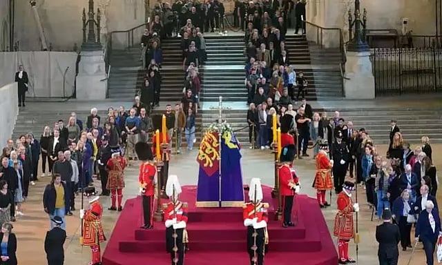 ராணி எலிசபெத்தின் இறுதிச் சடங்கில் பங்கேற்பதற்காக உலகத் தலைவர்கள் இங்கிலாந்திற்கு படையெடுத்துள்ளனர். லண்டனில் வெஸ்ட் மின்ஸ்டர் மண்டபத்தில் மேடையில் ராணியின் உடல், ராஜ மரியாதையுடன், கிரீடத்துடன் வைக்கப்பட்டுள்ளது. வெஸ்ட்மின்ஸ்டர் அபேயில் கடந்த ஆண்டு மறைந்த ராணியின் கணவர் அரசர் பிலிப் அடக்கம் செய்யப்பட்ட இடம் அருகே, நாளை ராணியின் உடல் நல்லடக்கம் செய்யப்பட உள்ளது.