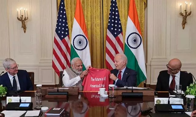 இந்த நிலையில் அமெரிக்க அதிபர் ஜோ பைடன் பிரதமர் நரேந்திர மோடிக்கு ஏஐ - செயற்கை நுண்ணறிவு (Artificial Intelligence) குறித்த பிரதமர் மோடியின் மேற்கொள் அச்சிடப்பட்ட டி-சர்ட்டை பரிசாக வழங்கினார். பிரதமர் மோடி, தனது வரலாற்று சிறப்புமிக்க அமெரிக்க காங்கிரஸ் உரையில், அமெரிக்கா மற்றும் இந்தியாவில் செயற்கை நுண்ணறிவின் முக்கியமான வளர்ச்சியை பாராட்டினார்.