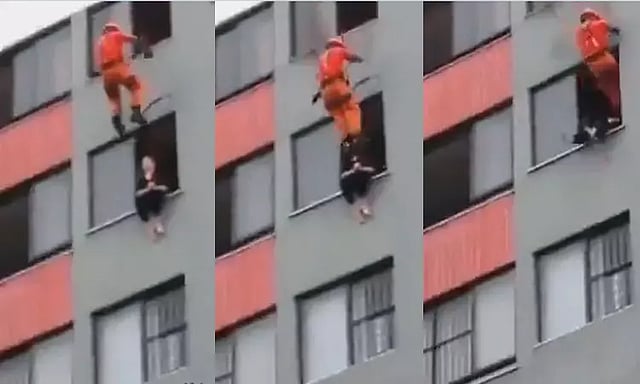 அந்த குடியிருப்பின் மேல் தளம் வழியே, மீட்பு பணிக்கான உபகரணங்களை இடுப்பில் கட்டி கொண்டு பாதுகாப்புடன் கீழே இறங்கி உள்ளார். பின்னர், திடீரென சுவரில் இருந்து உந்தி தள்ளி பின்னே சென்று, அப்படியே கீழே சென்று, அந்த பெண் எதிர்பாராதபோது அவரை இரு கால்களாலும் உதைத்து, அவரது குடியிருப்பிற்குள்ளேயே தள்ளி விட்டு காப்பாற்றி உள்ளார்.