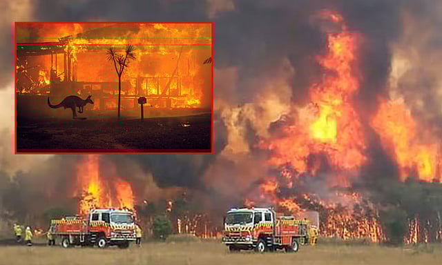 ஆஸ்திரேலியாவின் சில பகுதிகளில் வெப்பநிலை 50 டிகிரி செல்சியஸை எட்டியுள்ளதால், அங்குள்ள காடுகள் கொழுந்து விட்டு எரிகின்றன. விக்டோரியா மாகாணத்தில் மட்டும் 4 லட்சம் ஹெக்டேர் பரப்பளவிலான நிலங்கள் தீக்கிரையாகியுள்ளன. இதில் சுமார் 15,000 கால்நடைகள் உயிரிழந்துள்ளதாக தகவல்கள் தெரிவிக்கின்றன.