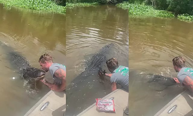 இந்நிலையில், அமெரிக்காவின் லூசியானா மாகாணத்தில் வாலிபர் ஒருவர் ஆற்றில் படகில் செல்லும்போது, கருப்பு நிற பெரிய முதலையை எதிர்கொள்கிறார். அது அவரை நோக்கி அருகே சென்றதும், பயப்படாமல் அதன் வாய் பகுதியில் அந்த இளைஞர் முத்தமிடுகிறார்.