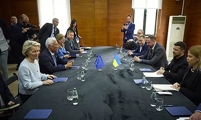 அப்ப்போது ரஷியா மீதான சர்வதேச அழுத்தத்தை அதிகரிக்க வேண்டியதன் அவசியத்தை ஜெலென்ஸ்கி வலியுறுத்தினார், மேலும் அமைதியை அடைவதற்கான முதல் படி போர்நிறுத்தம் என்றும் அவர் தெரிவித்தார். ராணுவ ஆதரவை வலுப்படுத்துதல், உக்ரைனின் வான் பாதுகாப்பு மற்றும் பாதுகாப்பு உற்பத்தி திறன்களை மேம்படுத்துதல் மற்றும் ஐரோப்பிய ஒன்றிய உறுப்பினர் பதவியை நோக்கிய உக்ரைனின் பாதையை விரைவுபடுத்துதல் ஆகியவற்றிலும் பேச்சுவார்த்தைகள் கவனம் செலுத்தப்பட்டதாக தகவல்கள் தெரிவிக்கின்றன.