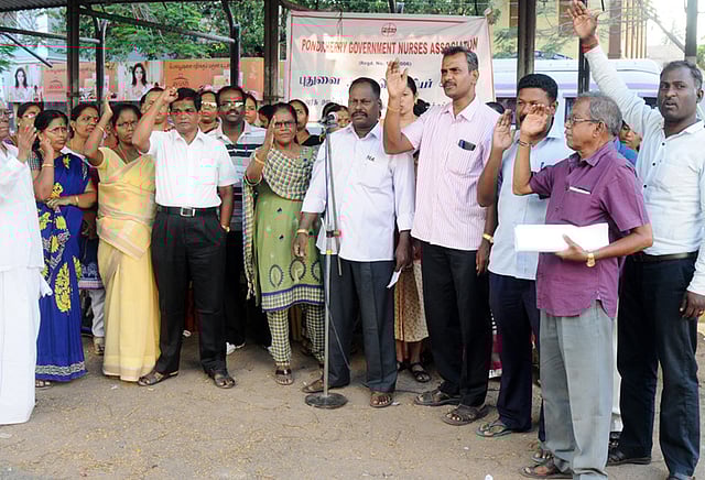 அரசு பொது மருத்துவமனையில் ஊழியர் நியமன விதிப்படி செவிலியர்கள் நியமனம் செய்ய வேண்டும், புதிதாக செவிலியர்கள் நியமிக்கப்படாமல் புதிய மருத்துவப் பிரிவுகளை தொடங்கக்கூடாது என்பன உள்ளிட்ட பல்வேறு கோரிக்கைகளை வலியுறுத்தி புதுச்சேரி அரசு செவிலியர் சங்கம் சார்பில் சுகாதாரத்துறை அலுவலகத்துக்குப் பின்புறம் உள்ள செஞ்சி சாலையில் கண்டன ஆர்ப்பாட்டம் நடைபெற்றது. சங்க தலைவர் சாந்தி தலைமை தாங்கினார். இதில் புதுச்சேரி அரசு ஊழியர் சம்மேளனத் தலைவர் சீத்தாராமன் மற்றும் நிர்வாகிகள் கலந்துகொண்டனர். துணைத்தலைவர் பாக்கியவாதி கண்டன உரையாற்றினார்.