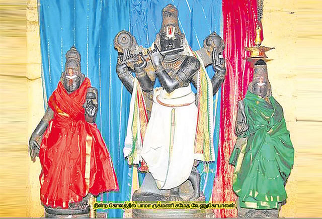 திருமாலின் 18 அடி சிலையை, திருச்சித்ரக்கூடத்தில் பிரதிஷ்டை செய்ய இடம் கிடைக்காத ஆதங்கத்தில் இருந்த வைணவர்கள், தில்லைவனத்திற்கு போட்டியாக தீர்த்தவனத்தை உருவாக்க நிலைப்பாடு கொண்டனர். அதன்படி தில்லையில் காலைத்தூக்கி நின்றாடும் நடராஜபெருமானுக்கு ஒப்பாக, கால் மடித்து ஊன்றி நின்று வேய்குழல் ஊதும் வேணுகோபாலனை பாமா- ருக்மணி சமேதராக தனி சன்னிதி அமைத்து மூலவராக்கினர். திருமூலட்டானத்து இறைவனுக்கு நிகராக வைகுண்டவாச பெருமாளையும் தொடர்ந்து ஆண்டாள், ஆழ்வார்கள், உடையவர் ஆகிய மூர்த்தங்களையும் பிரதிஷ்டை செய்தனர். இப்படி சிதம்பரத்தைப் பார்த்து ஒவ்வொரு சன்னிதியாக உருவாக்கினர் என்கிறது வரலாறு.