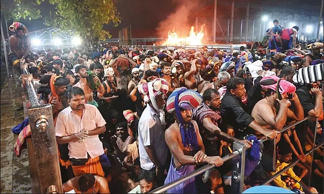 சபரிமலை அய்யப்பன் கோவிலில் நடப்பு சீசனையொட்டி கடந்த மாதம் 16 -ந் தேதி நடை திறக்கப்பட்டு பூஜைகள் நடந்து வருகிறது. தினமும் ஏராளமான அய்யப்ப பக்தர்கள் மாலை அணிந்து, இருமுடி கட்டி முன்பதிவு செய்து அய்யப்பனை தரிசனம் செய்து வருகிறார்கள். சபரிமலைக்கு பக்தர்களின் எண்ணிக்கை நாளுக்கு நாள் அதிகரித்து வருவதால் மரக்கூட்டம் வரை நீண்ட வரிசையில் 9 மணி நேரத்திற்கும் மேலாக காத்திருந்து தரிசனம் செய்து வருகிறார்கள்.