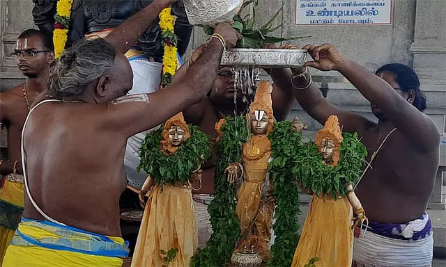 4-ம் திருவிழாவான இன்று காலையில் யாகசாலை பூஜையும் 10.30 மணிக்கு உற்சவர்களுக்கு ஸ்னாபன திருமஞ்சனம் சாத்துதலும் அபிஷேகமும் நடந்தது. இந்த பவித்ர உற்சவ சிறப்பு அபிஷேகத்தை திருமலை திருப்பதி தேவஸ்தான ஆகம ஆலோசகர் வரதப்பட்டர் மற்றும் கங்கனப்பட்டர் பாலாஜி ஆகியோர் தலைமையில் 10 அர்ச்சகர்கள் நடத்தினார்கள்.