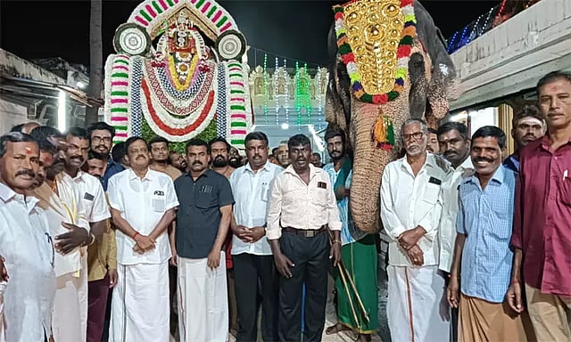 கோவிலின் கிழக்கு பக்கம் உள்ள அலங்கார மண்டபத்தில் இருந்து புறப்பட்ட அம்மனின் வாகனம், 3-வது முறை பவனி வரும்போது ஓதுவார்களின் அபிராமி அந்தாதி மற்றும் தேவார பாடல் பாடினர். கோவிலின் மேற்கு பக்கம் உள்ள வெளிப் பிரகார மண்டபத்தில் அம்மன் எழுந்தருளி இருந்த வெள்ளி கலைமான் வாகனத்தை மூங்கில் தண்டையத்தில் அமர வைத்து தீபாராதனை காட்டப்பட்டது. அதன்பிறகு இறுதியாக தாலாட்டு பாடலுடன் கூடிய நாதஸ்வர இசையுடன் அம்மனின் வாகன பவனி நிறைவடைந்தது.