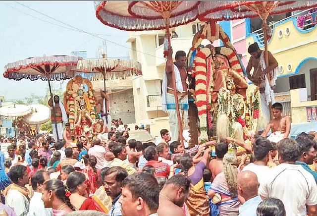 3 கருட வாகனங்களில் எழுந்தருளிய பெருமாள்களும் சன்னதி தெரு, டிரங்க் ரோடு என கோவிலின் முக்கிய மாட வீதிகளின் வழியாக ஊர்வலமாக எடுத்து செல்லப்பட்டு மீண்டும் கோவில் வளாகத்தை வந்தடைந்தனர். இதில் ஏராளமான பக்தர்கள் கலந்து கொண்டு சாமி தரிசனம் செய்தனர். அனைவருக்கும் அன்னதானம் வழங்கப்பட்டது. விழா ஏற்பாடுகளை கோவில் செயல் அலுவலர் அமுதா செய்து இருந்தார்.
