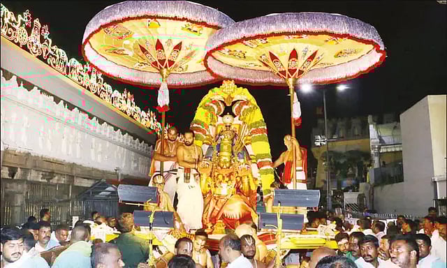 உற்சவர் மலையப்பசாமி தங்க, வைர நகைகளால் அலங்காரம் செய்யப்பட்டு, தங்கக் கருட வாகனத்தில் எழுந்தருளி கோவிலின் நான்கு மாடவீதிகளில் இரவு 7 மணியில் இருந்து இரவு 9 மணிவரை உலா வந்து பக்தர்களுக்கு அருள் பாலித்தார். மாடவீதிகளில் கூடியிருந்த பக்தர்கள் கோவிந்தா... கோவிந்தா என கோஷம் எழுப்பி சாமி தரிசனம் செய்தனர்.