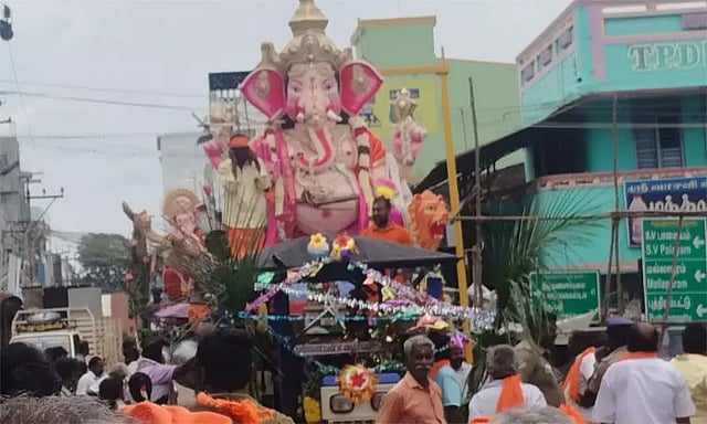 சதுர்த்தி விழா முடிந்து 5-வது நாளான இன்று விநாயகர் ஊர்வலம் நடைபெற்றது. 11 விநாயகர் சிலைகளும் வாகனங்கள் மூலம் கடைவீதிக்கு கொண்டு செல்லப்பட்டன. பின்னர் அங்கு சிறப்பு பூஜை நடத்தப்பட்டு தீபாராதனை காண்பிக்கப்பட்டது. அதனைத் தொடர்ந்து மேள தாளங்கள் முழங்க விநாயகர் சிலைகள் ஊர்வலமாக ஏரிக்கு கொண்டு செல்லப்பட்டு ஒன்றன்பின் ஒன்றாக கரைக்கப்பட்டன.