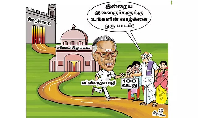 லட்சுமிகாந்தன் பாரதியின் வாழ்க்கை முதல்-அமைச்சர் மு.க.ஸ்டாலின் சொன்னதுபோல இன்றைய தலைமுறைக்கு வாழ்க்கை பாடமாக அமைந்துள்ளது. நூறு ஆண்டை தொட்டுப்பிடிக்கும் அவர் இன்றும் துடிப்பான இளைஞரைப்போல சுறுசுறுப்பாகவும், ஆரோக்கியமாகவும் வாழும் வாழ்க்கை அனைவரும் பின்பற்றவேண்டியதாகும். தென்காசி பக்கத்தில் உள்ள நயினாரகரம் என்ற ஊரில் பிறந்த லட்சுமிகாந்தன் பாரதி தனது தாய், தந்தை, பெரியம்மா, சகோதரி என்று அனைவரோடும் இணைந்து சிறுவயதிலேயே சுதந்திர போராட்டத்தில் ஈடுபட்டார். மதுரை அமெரிக்கன் கல்லூரியில் படிக்கும்போது சுதந்திர போராட்டத்தில் ஈடுபட்டதால் லட்சுமிகாந்தன் பாரதியை போலீசார் கைது செய்தனர். பின்னர் அவரை ஆரப்பாளையம் சிறைச்சாலையில் இருந்து கையில் விலங்கிட்டு சாலையில் நடத்திக் கூட்டிக்கொண்டு வைகையின் வடகரையில் இருந்த கலெக்டர் அலுவலகத்தில் கலெக்டர் முன்பு ஆஜர் படுத்தினர்.
