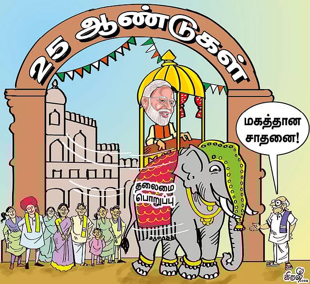 பிரதமர் நரேந்திர மோடி கடந்த வாரம் செவ்வாய்க்கிழமை சமூக வலைத்தளத்தில் தான் மத்திய, மாநில அரசுகளின் தலைமை பொறுப்பில் 25-வது ஆண்டில் காலெடுத்து வைப்பதை நினைவு கூர்ந்து சில செய்திகளை வெளியிட்டு இருந்தார். முதல் முறையாக 2001-ம் ஆண்டில் இதே நாளில் குஜராத் முதல்-மந்திரியாக பொறுப்பேற்றேன். அதற்கு 9 மாதங்களுக்கு முன்பு நடந்த புஜ் பூகம்பத்தினால் ஏற்பட்ட அழிவுகளின் வடுக்கள் ஆறாத நிலையில் மக்கள் பெரிதும் பாதிக்கப்பட்டு இருந்தனர். மேலும் ஸ்திரமற்ற அரசியல் சூழ்நிலை நிலவி வந்த நிலையில், அதற்கு முன்பு வீசிய கடும் புயல் தொடர்ந்து ஏற்பட்ட வறட்சியால் குஜராத் பாதிப்புக்குள்ளான நேரத்தில் நான் இந்த பதவிப்பொறுப்பை ஏற்றேன் என்று கூறியிருக்கிறார். மோடி முதல்-மந்திரி ஆவதற்கு முன்பு ஆர்.எஸ்.எஸ். இயக்க உறுப்பினராகவும், பா.ஜனதா கட்சி நிர்வாகியாகவும் மட்டுமே இருந்தார்.