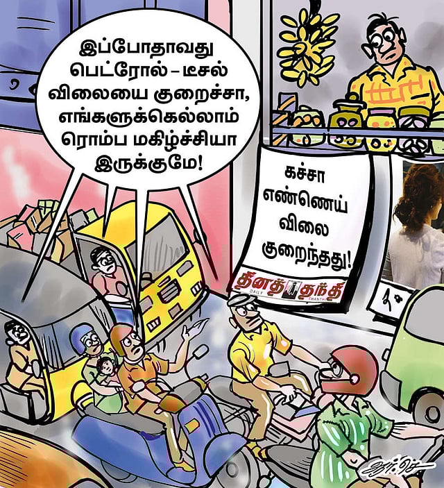 இப்போது கச்சா எண்ணெய் விலை ஒரு பீப்பாய்க்கு 68.56 டாலர் என்ற அளவில்தான் இருக்கிறது. ஆனால், பெட்ரோல் விலை லிட்டருக்கு ரூ.100.75 ஆகவும், டீசல் விலை ஒரு லிட்டருக்கு ரூ.92.34 ஆகவும் இருக்கிறது. இப்போது இருக்கும் பெட்ரோல்-டீசல் விலை கடந்த மார்ச் மாதம் 28-ந்தேதி முதல் எந்தவித மாற்றமும் இல்லாமல் இருக்கிறது. மார்ச் 28-ந்தேதி கச்சா எண்ணெய் விலை 83.69 அமெரிக்க டாலராக இருந்தது. கச்சா எண்ணெயின் சர்வதேச விலை குறைந்தபோதும், இந்தியாவில் பெட்ரோல்-டீசல் விலை குறையவில்லை. தேர்தல் வந்தால் மட்டும் குறைக்கப்பட்டு விடுகிறது.
