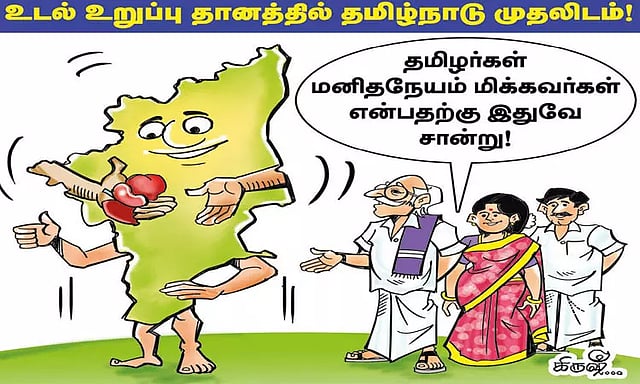 இந்தியாவிலேயே தமிழ்நாடுதான் உடல் உறுப்பு தானத்தில் முதல் இடத்தில் இருக்கிறது என்று மருத்துவம் - மக்கள் நல்வாழ்வுத் துறை அமைச்சர் மா.சுப்பிரமணியன், துறையின் முதன்மை செயலாளர் ககன்தீப்சிங் பேடி ஆகியேர் பெருமிதத்துடன் கூறினார்கள். உடல் உறுப்பு தானத்தில் தேசிய சராசரியைவிட 7 மடங்கு அதிகமாக பதிவாகி தமிழ்நாடு மனிதாபிமானமிக்க கருணை மாநிலம் என்பதை எடுத்துக்காட்டிவிட்டது.