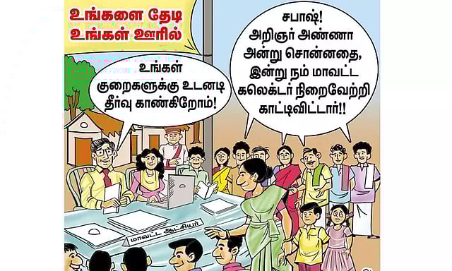 மக்கள் தங்கள் குறைகளுக்கு தீர்வுகாண கலெக்டர் உள்ளிட்ட அதிகாரிகளை சந்திக்க, கால்கடுக்க நின்று மனு கொடுத்த காலம் எல்லாம் போய்விட்டது. இப்போது மக்களை அதிகாரிகளே தேடிவரும் காலம் வந்துவிட்டது. இந்தக் கொள்கையை முதல்-அமைச்சர் மு.க.ஸ்டாலின் ஆட்சிக்கு வருவதற்கு முன்பே தொடங்கிவிட்டார். தேர்தல் பிரசாரத்திற்கு ஒவ்வொரு ஊருக்கும் அவர் சென்றபோது, 'உங்கள் தொகுதியில் ஸ்டாலின்' என்று எழுதப்பட்ட ஒரு பெட்டியை மேடையில் வைத்திருந்தார். அந்தத் தொகுதி மக்கள், தங்கள் குறைகளை மனுவாக எழுதி அதில் போடலாம். அந்தப் பெட்டியை பூட்டி அதன் சாவியைத் தானே வைத்துக்கொள்வேன். தேர்தலில் வெற்றி பெற்று ஆட்சி அமைத்தவுடன் அந்த மனுக்கள் மீது நடவடிக்கை எடுப்பதே முதல் வேலை என்றார். அதேபோல, முதல்-அமைச்சர் பொறுப்பையேற்றவுடன், இதற்காக ஷில்பா பிரபாகர் சதீஷ் என்ற ஐ.ஏ.எஸ். அதிகாரியை நியமித்து, அந்த மனுக்கள் மீது நடவடிக்கை எடுக்க வைத்தார்.