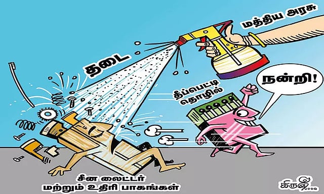 தமிழ்நாட்டில் தீப்பெட்டி தொழில் 8 லட்சம் பேருக்கு நேரடியாகவும், மறைமுகமாகவும் வேலைவாய்ப்பு அளிக்கிறது. இங்கு தயாரிக்கப்படும் தீப்பெட்டியின் விலையும் மிகக்குறைவு. இந்த நிலையில், கடந்த 2020-ல் சீனாவில் இருந்து இறக்குமதி செய்யப்பட்ட லைட்டர்கள் இந்த தொழிலை நலிவடைய செய்தது. ஒரு மாதத்துக்கு 50 லட்சம் பண்டல்கள் (ஒரு பண்டலில் 600 தீப்பெட்டிகள் இருக்கும்) உற்பத்தி செய்யப்பட்ட நிலையில், சீன லைட்டர்கள் வரவுக்கு பின் 10 லட்சம் பண்டல்களின் உற்பத்தி குறைந்தது. தொழிலாளர்களின் வாழ்வாதாரமும் பாதிக்கப்பட்டது. சில தீப்பெட்டி தொழிற்சாலைகள் மூடப்பட்டன.