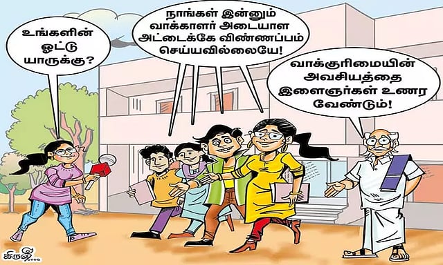 ஆனால், இன்றைய இளைஞர்கள் சமுதாய அக்கறை இல்லாமல் சுயநல தேடுதலோடு தங்கள் எல்லைகளை சுருக்கிக்கொள்கிறார்கள். தங்களை ஆளப்போகிறவர்களை தேர்ந்தெடுக்கும் மிகப்பெரிய உரிமை அவர்களுக்கு கொடுக்கப்பட்டுள்ளது. அடுத்த 5 ஆண்டுகளுக்கு அரசமைக்கபோவது யார்? என்பதை நிர்ணயிக்கும் மிகப்பெரிய ஜனநாயக கடமையாற்ற ஒரு உபகரணம்தான் வாக்காளர் பட்டியலில் இடம்பெறுவது என்பதை உணராமல் இருப்பது கவலையளிக்கிறது. எனவே, வாக்களிப்பது குறித்த விழிப்புணர்வு பிரசாரங்கள் மிக தீவிரமாக நடப்பதுபோல, புதிதாக 18 வயது பூர்த்தி அடைந்தவர்கள் தங்கள் பெயர்களை வாக்காளர் பட்டியலில் ஆண்டுதோறும் சேர்ப்பதை உறுதிசெய்ய கல்லூரிகளுக்கே நேரடியாக சென்று மாணவர்களிடம் புரியவைக்கவேண்டும். இதற்கான நடைமுறைகளும் எளிதாக்கப்படவேண்டும்.