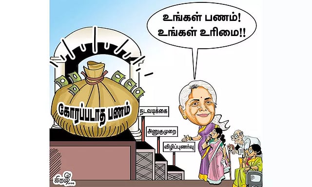 பெரும்பாலும் இந்த தொகையை பெறுவதற்கான வழிமுறைகள் மக்களுக்கு தெரிவதில்லை. மக்களுடைய பணம் மக்களுக்கே போய் சேரவேண்டும் என்ற நோக்கில் இப்போது நிதி மந்திரி நிர்மலா சீதாராமன், உங்கள் பணம்; உங்கள் உரிமை என்ற பெயரில் பிரசார இயக்கத்தை தொடங்கி வைத்துள்ளார். இதில் அவர், விழிப்புணர்வு, அணுகுமுறை மற்றும் நடவடிக்கை என்ற 3 முக்கிய அம்சங்களை வெளியிட்டுள்ளார். முதலாவதாக கோரப்படாமல் இருக்கும் பணம் குறித்து உரியவர்களிடம் வங்கிகளும், மற்ற நிறுவனங்களும் தெரிவித்து அதுகுறித்து விழிப்புணர்வை ஏற்படுத்தி அவர்களுக்கு உதவவேண்டும். அவர்களோடு தொடர்பு ஏற்படுத்திக்கொண்டு உதவவேண்டும். அடுத்து அவர்களுடைய பணம் அவர்களுக்கு கிடைக்கும் வகையில் விரைவான நடவடிக்கை எடுக்கவேண்டும். நிர்மலா சீதாராமனின் இந்த நடவடிக்கை மிகவும் பாராட்டுக்குரியது. ஆனால் இந்த திட்டம் சாதாரண பாமர மக்களுக்கும் புரியும் வகையில் விளம்பரங்கள் செய்யப்பட்டால்தான் அரசின் நோக்கமும் நிறைவேறும். மக்களின் பணமும் மக்களுக்கே போய் சேரும்.