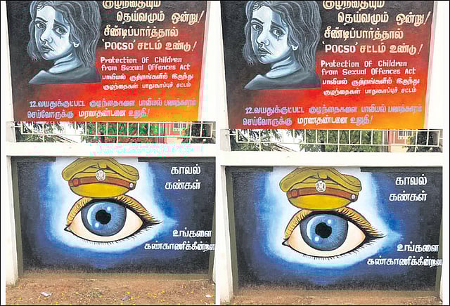 போலீஸ் நிலைய மதில் சுவரில் அர்த்தமுள்ள வாசகங்களுடன் ஓவியங்கள் வரையப்பட்டு உள்ளது. புகார் கொடுக்க வரும் பொதுமக்கள் அந்த வாசகங்களை படித்து பார்க்கின்றனர்.