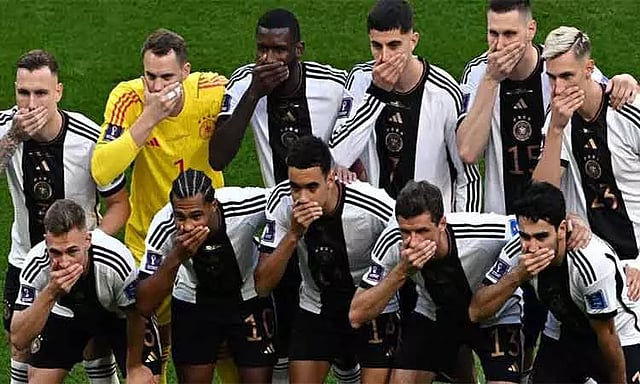 இந்த நிலையில் ஜெர்மனி அணியினர் நேற்று ஜப்பானுக்கு எதிரான ஆட்டம் தொடங்குவதற்கு முன்பாக மைதானத்தில் தங்களது வாயை பொத்தியபடி போட்டோவுக்கு போஸ் கொடுத்து கவனத்தை ஈர்த்தனர். 'வானவில் பட்டையை அணிவதற்கு தடை விதிப்பது எங்களது பேச்சுரிமையை பறிப்பதற்கு சமமாகும். இந்த விவகாரத்தில் எங்களது நிலைப்பாட்டில் மாற்றமில்லை' என்று ஜெர்மனி கால்பந்து சம்மேளனம் டுவிட்டர் பக்கத்தில் கூறியுள்ளது. அதே சமயம் ஜெர்மனி உள்துறை மந்திரி நான்சி பாசிர் வானவில் பட்டையை கையில் கட்டிக்கொண்டு உலக கோப்பை போட்டியை கண்டுகளித்தார்.